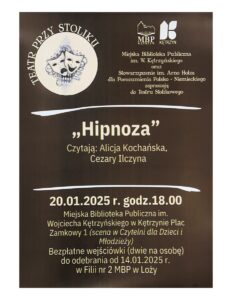 20 stycznia 2025 roku, w poniedziałek zapraszamy Państwa na godzinę 18.00 do Teatru przy Stoliku na spektakl „Hipnoza”.